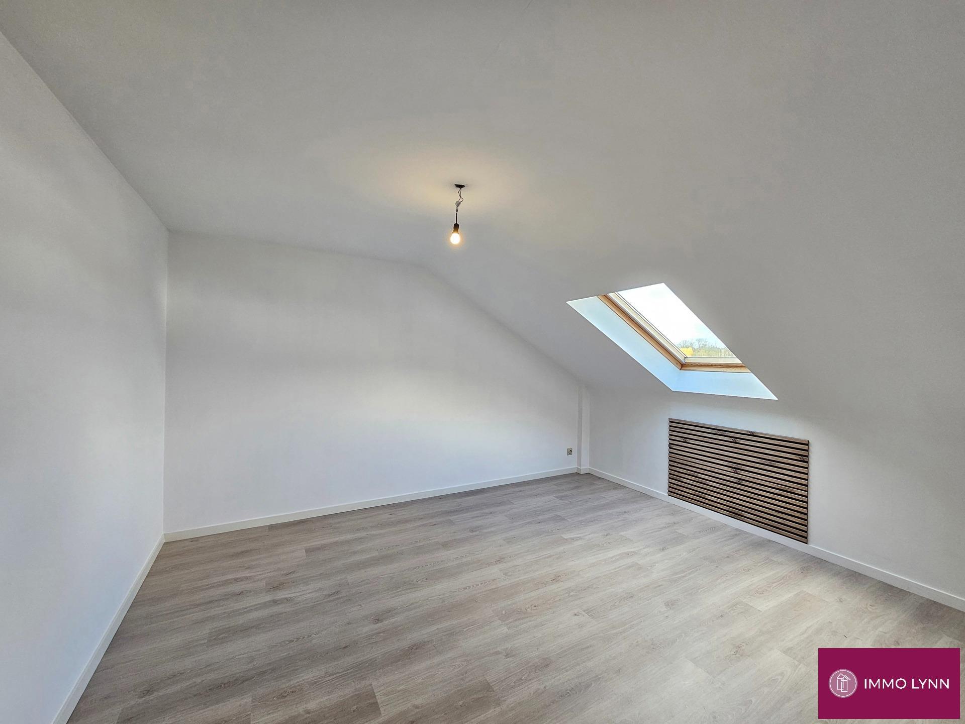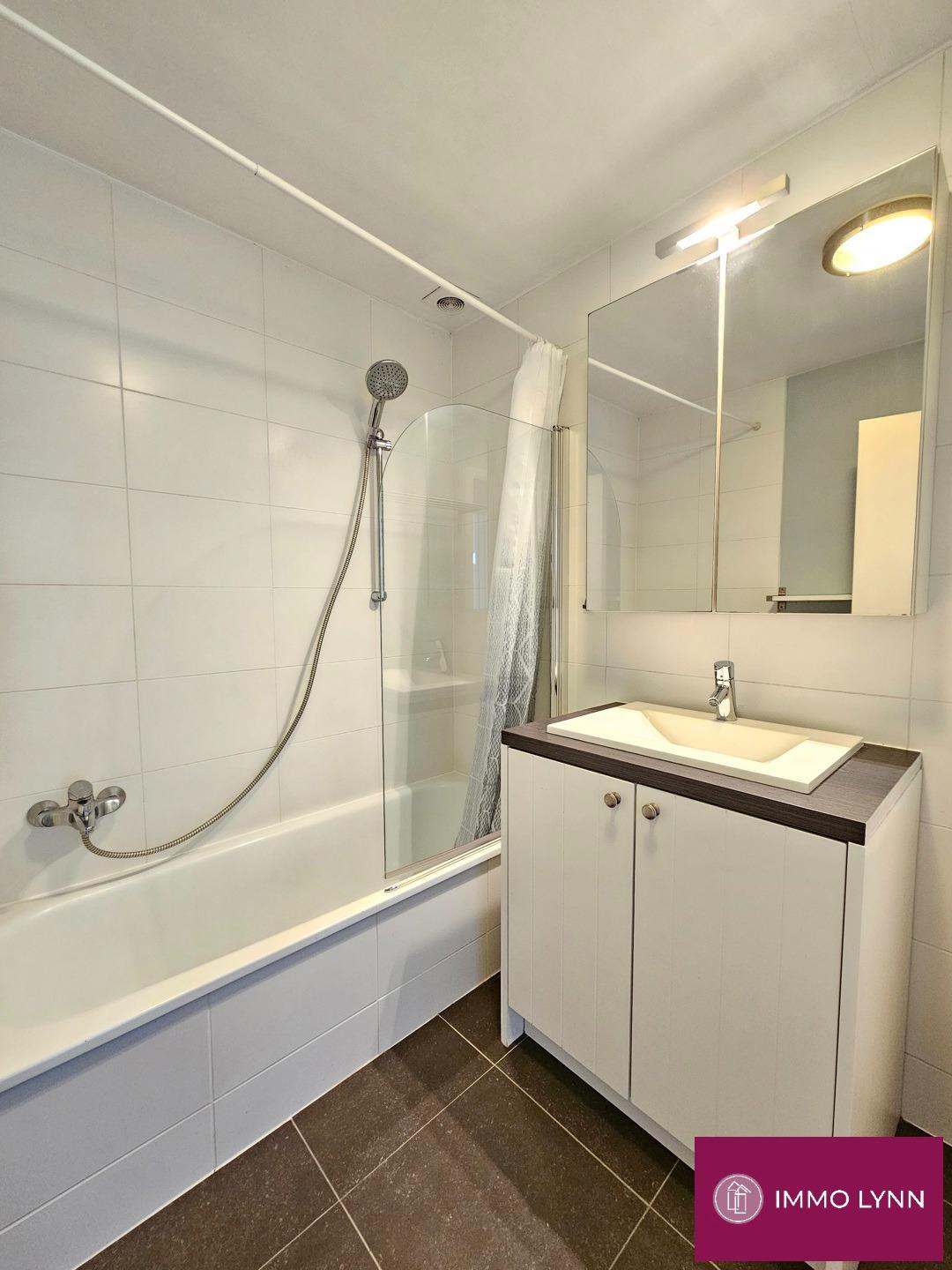 Modern duplex appartement met 2 kamers en autostaanplaats. Indeling: inkomhal, apart toilet, woonkamer met open uitgeruste keuken en berging. Op de 2de verdieping: nachthal, 2 slaapkamers en badkamer met badkamermeubel met 1 lavabo en ligbad. Privatieve autostaanplaats in ondergrondse parking. Goed gelegen, op wandelafstand van openbaar vervoer, winkels en scholen. Gemeenschappelijke kosten: 85 euro per maand.